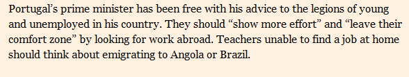 According to Peter Wise, writing in the Financial Times, "Portugal’s prime minister has been free with his advice to the legions of young and unemployed in his country. They should “show more effort” and “leave their comfort zone” by looking for work abroad. Teachers unable to find a job at home should think about emigrating to Angola or Brazil". The background to this controversy is, as Peter points out, the sudden emergence of Portugal as an origin country for emigration.