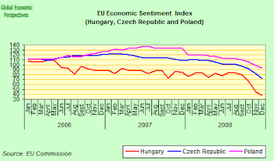 This is basically the third in a series of posts, where I have looked at the short term outlook for three key central European economies: Poland (here), Hungary (here) and the CR, and the conclusion is that they are all headed into or near to the contraction zone in 2009. Cetainly Hungary is the worst case scenario, and Poland is struggling with a complex set of forex issues, but even the Czech Republic can not expect to escape unscathed.